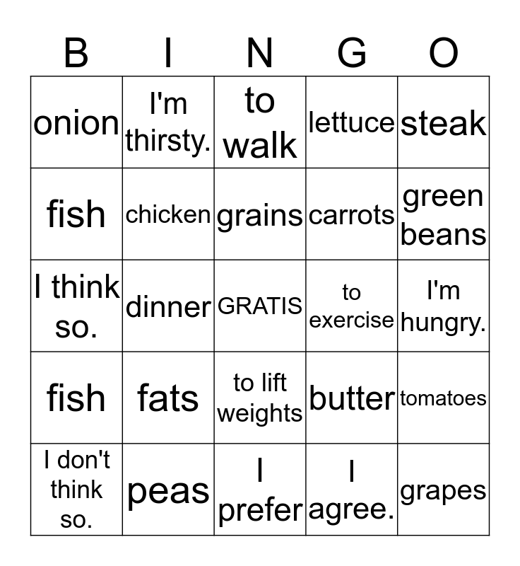 This bingo card has a free space and 24 words: fats, peas, grains, I don't think so., steak, onion, fish, I'm thirsty., to exercise, to lift weights, carrots, I think so., butter, tomatoes, chicken, I agree., I'm hungry., to walk, green beans, dinner, grapes, fish, lettuce and I prefer.
