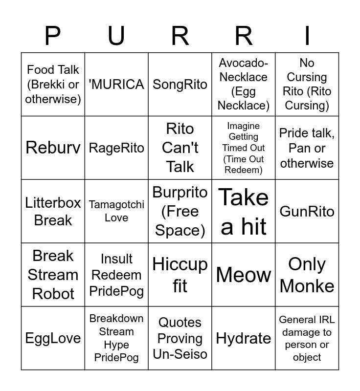 This bingo card has a free space and 24 words: Insult Redeem PridePog, Breakdown Stream Hype PridePog, Rito Can't Talk, EggLove, No Cursing Rito (Rito Cursing), Food Talk (Brekki or otherwise), Reburv, 'MURICA, Take a hit, Hiccup fit, Imagine Getting Timed Out (Time Out Redeem), Litterbox Break, Meow, Only Monke, RageRito, Hydrate, GunRito, SongRito, Pride talk, Pan or otherwise, Tamagotchi Love, General IRL damage to person or object, Break Stream Robot, Avocado-Necklace (Egg Necklace) and Quotes Proving Un-Seiso.