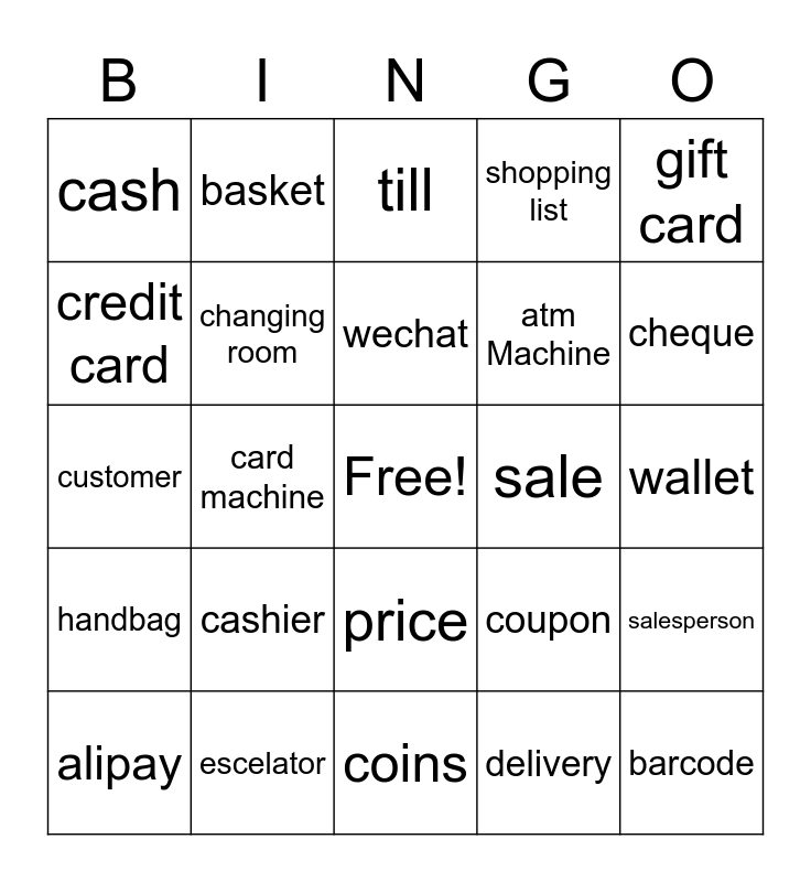 This bingo card has a free space and 25 words: cashier, coins, wechat, alipay, gift card, cash, credit card, basket, sale, price, atm Machine, customer, coupon, salesperson, changing room, elevator, wallet, till, cheque, card machine, barcode, escelator, handbag, shopping list and delivery.