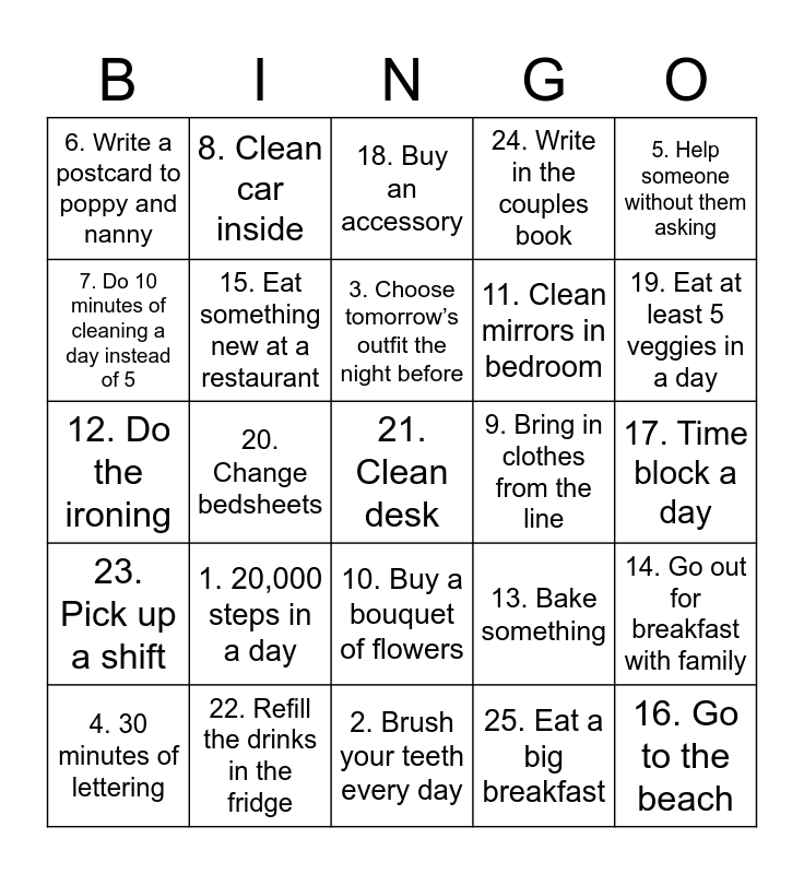 This bingo card has 25 words: 1. 20,000 steps in a day, 2. Brush your teeth every day, 3. Choose tomorrow’s outfit the night before, 4. 30 minutes of lettering, 5. Help someone without them asking, 6. Write a postcard to poppy and nanny, 7. Do 10 minutes of cleaning a day instead of 5, 8. Clean car inside, 9. Bring in clothes from the line, 10. Buy a bouquet of flowers, 11. Clean mirrors in bedroom, 12. Do the ironing, 13. Bake something, 14. Go out for breakfast with family, 15. Eat something new at a restaurant, 16. Go to the beach, 17. Time block a day, 18. Buy an accessory, 19. Eat at least 5 veggies in a day, 20. Change bedsheets, 21. Clean desk, 22. Refill the drinks in the fridge, 23. Pick up a shift, 24. Write in the couples book and 25. Eat a big breakfast.