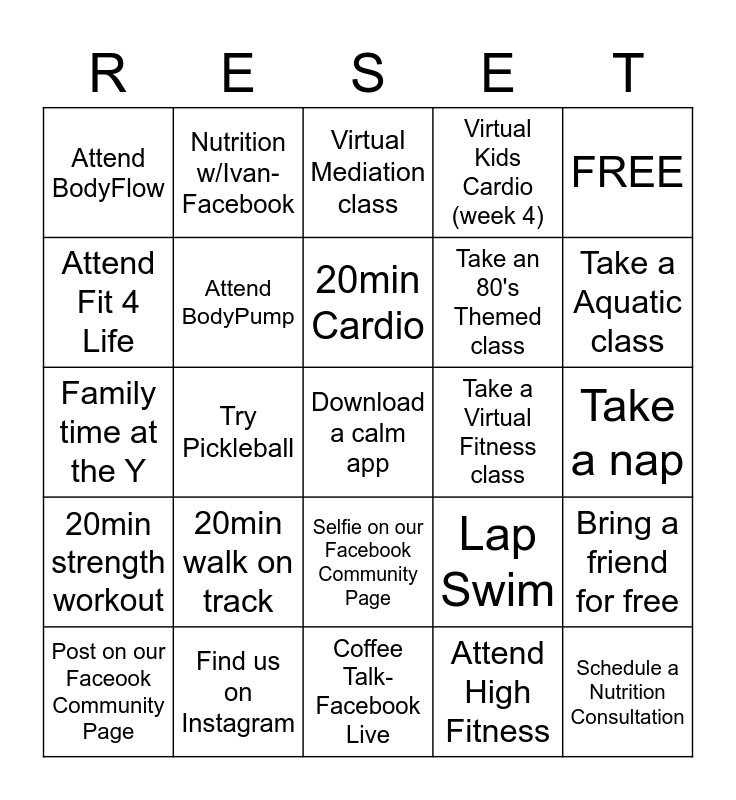 This bingo card has a free space and 24 words: 20min walk on track, Find us on Instagram, 20min Cardio, Post on our Faceook Community Page, FREE, Attend BodyFlow, Attend Fit 4 Life, Nutrition w/Ivan-Facebook, Take a Virtual Fitness class, Selfie on our Facebook Community Page, Take an 80's Themed class, Family time at the Y, Lap Swim, Bring a friend for free, Attend BodyPump, Attend High Fitness, Take a nap, Virtual Mediation class, Take a Aquatic class, Try Pickleball, Schedule a Nutrition Consultation, 20min strength workout, Virtual Kids Cardio (week 4) and Coffee Talk-Facebook Live.