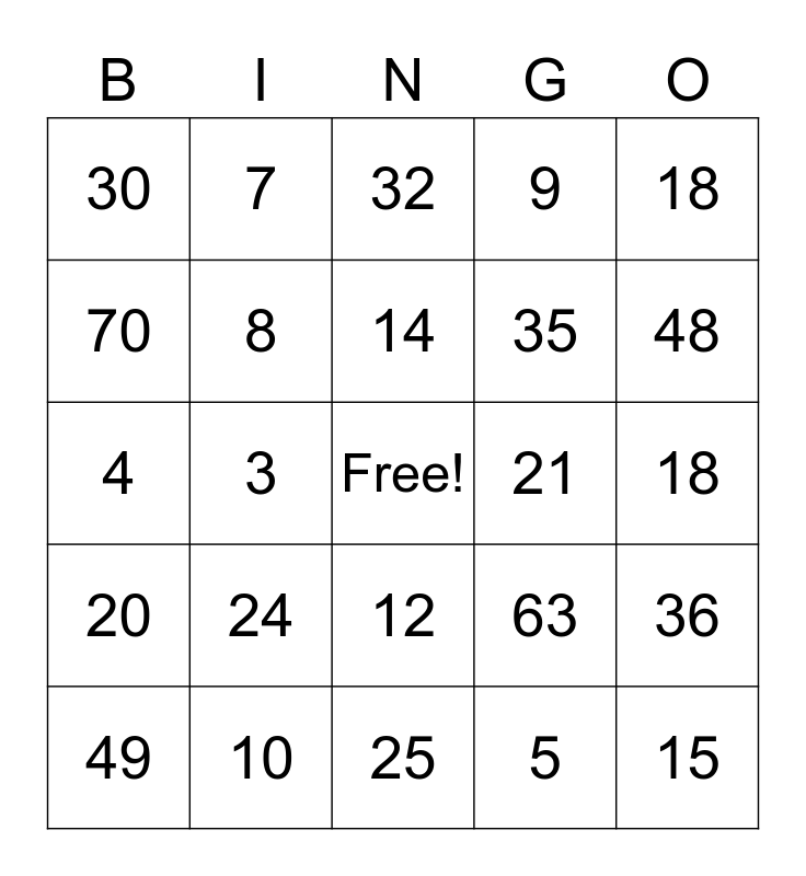 This bingo card has a free space and 41 words: 2, 4, 6, 8, 10, 12, 14, 16, 18, 20, 3, 9, 15, 18, 21, 24, 27, 30, 28, 32, 36, 40, 25, 35, 45, 50, 5, 42, 48, 54, 60, 7, 49, 56, 63, 70, 64, 72, 80, 100 and 90.
