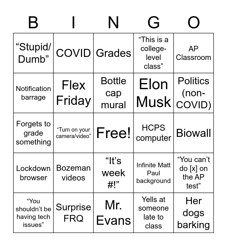 This bingo card has a free space and 44 words: Her birds screeching, Her dogs barking, Mentions her husband, “You shouldn’t be having tech issues”, Disturbed by Austin’s jokes, Yells at someone late to class, Grades, Labster, AP Classroom, Surprise FRQ, “This is a college-level class”, HCPS computer, “It’s week #!”, Bozeman videos, Matthew Paul, Mr. Evans, “Do things that aren’t graded”, Forgets to grade something, Grades something unexpectedly, Politics (non-COVID), COVID, Horseshoe crabs, Complains about another class, “Stupid/ Dumb”, AP Videos, Biowall, Incoherent noises, BLM background, Infinite Matt Paul background, Lockdown browser, College Board, “You can’t do [x] on the AP test”, SNHS, Swears, “Turn on your camera/video”, Mentions that she is old, Says someone’s name 3 times in a row, SRT, Bottle cap mural, Notification barrage, Elon Musk, Complains about the freshmen, Flex Friday and Interrupts a student.