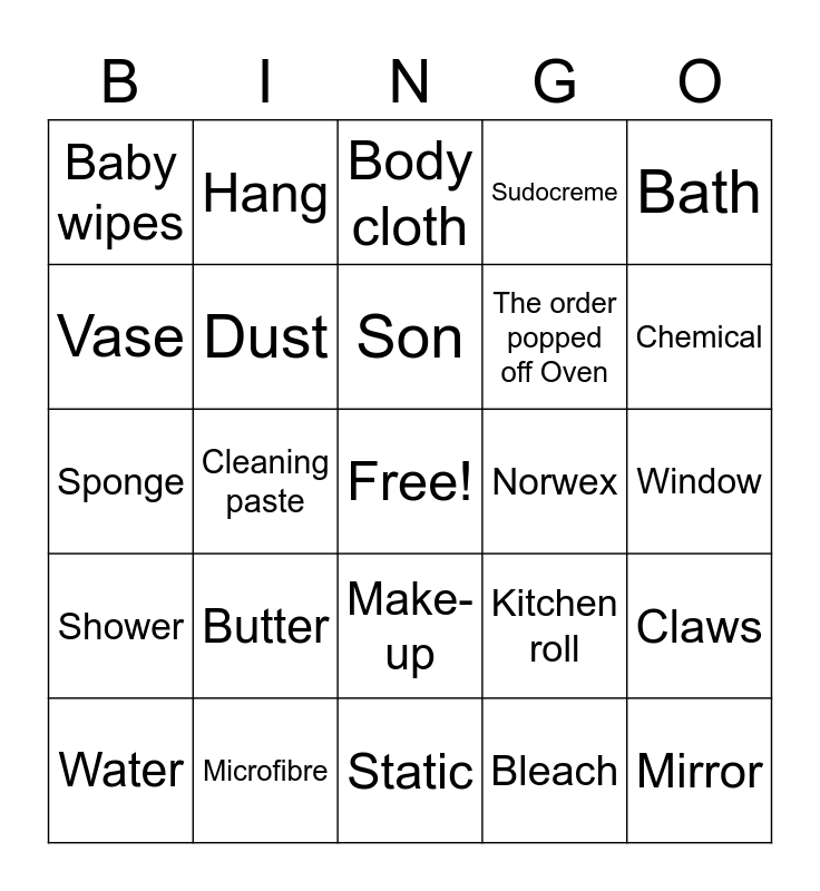 This bingo card has a free space and 29 words: Water, BacLock, Cleaning paste, No smell, Baby wipes, Body cloth, Dust, Butter, Norwex, Microfibre, Window, Mirror, Static, Bleach, Chemical, Solution, Make-up, Shower, Bath, Sponge, Kitchen roll, Polish, The order popped off Oven, Vase, Sudocreme, Hang, Claws, Son and Daughter.
