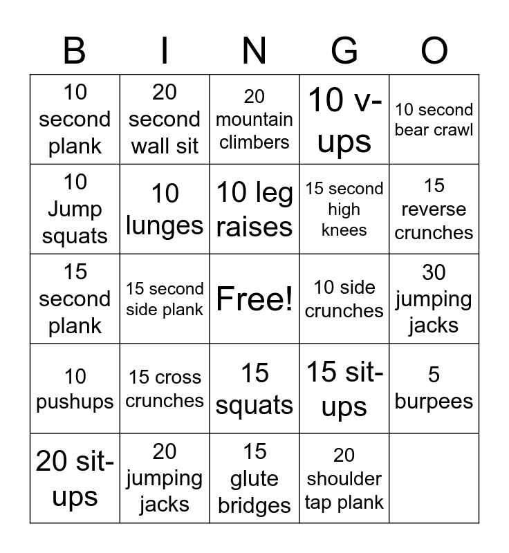 This bingo card has a free space and 24 words: 10 pushups, 20 jumping jacks, 15 squats, 15 sit-ups, 10 second bear crawl, 10 second plank, 20 second wall sit, 20 mountain climbers, 15 second high knees, 5 burpees, 10 Jump squats, 10 lunges, 15 pushups, 10 side crunches, 15 reverse crunches, 20 sit-ups, 15 second side plank, 10 leg raises, 10 v-ups, 30 jumping jacks, 15 second plank, 15 cross crunches, 15 glute bridges and 20 shoulder tap plank.