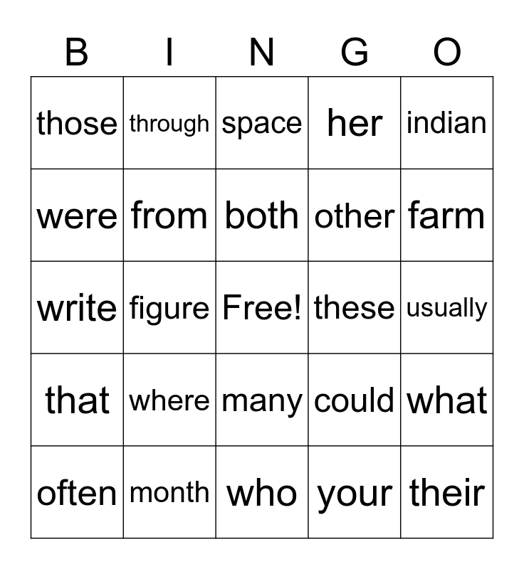 This bingo card has a free space and 24 words: where, month, both, often, indian, those, were, through, these, many, other, write, could, what, from, your, usually, space, farm, figure, their, that, her and who.