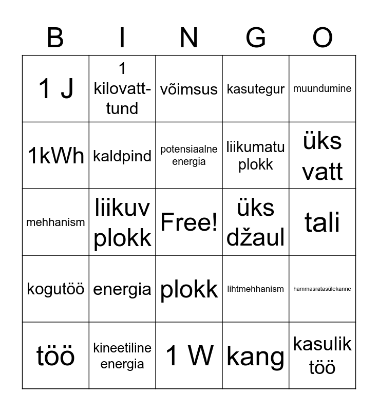 This bingo card has a free space and 24 words: energia, kineetiline energia, potensiaalne energia, töö, muundumine, 1 J, 1kWh, 1 kilovatt-tund, üks džaul, plokk, liikumatu plokk, mehhanism, lihtmehhanism, hammasratasülekanne, kaldpind, kang, tali, võimsus, üks vatt, liikuv plokk, kasulik töö, kogutöö, kasutegur and 1 W.