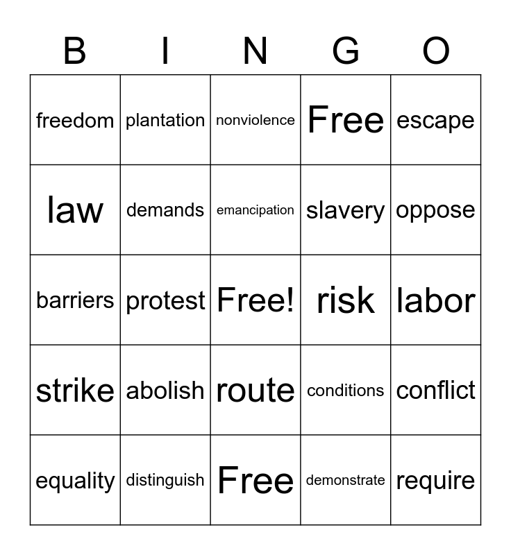 This bingo card has a free space and 24 words: abolish, distinguish, emancipation, equality, escape, freedom, law, plantation, risk, route, slavery, barriers, conditions, conflict, demands, demonstrate, labor, nonviolence, oppose, protest, require, strike, Free and Free.