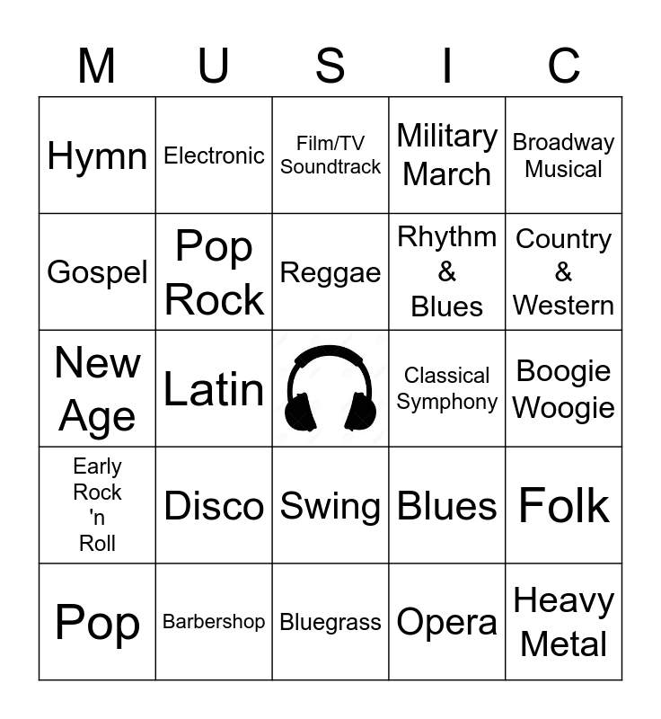 This bingo card has a free space and 24 words: Disco, Barbershop, Reggae, Pop, Broadway Musical, Hymn, Gospel, Electronic, Classical Symphony, Swing, Rhythm & Blues, New Age, Blues, Folk, Pop Rock, Opera, Boogie Woogie, Film/TV Soundtrack, Country & Western, Latin, Heavy Metal, Early Rock 'n Roll, Military March and Bluegrass.