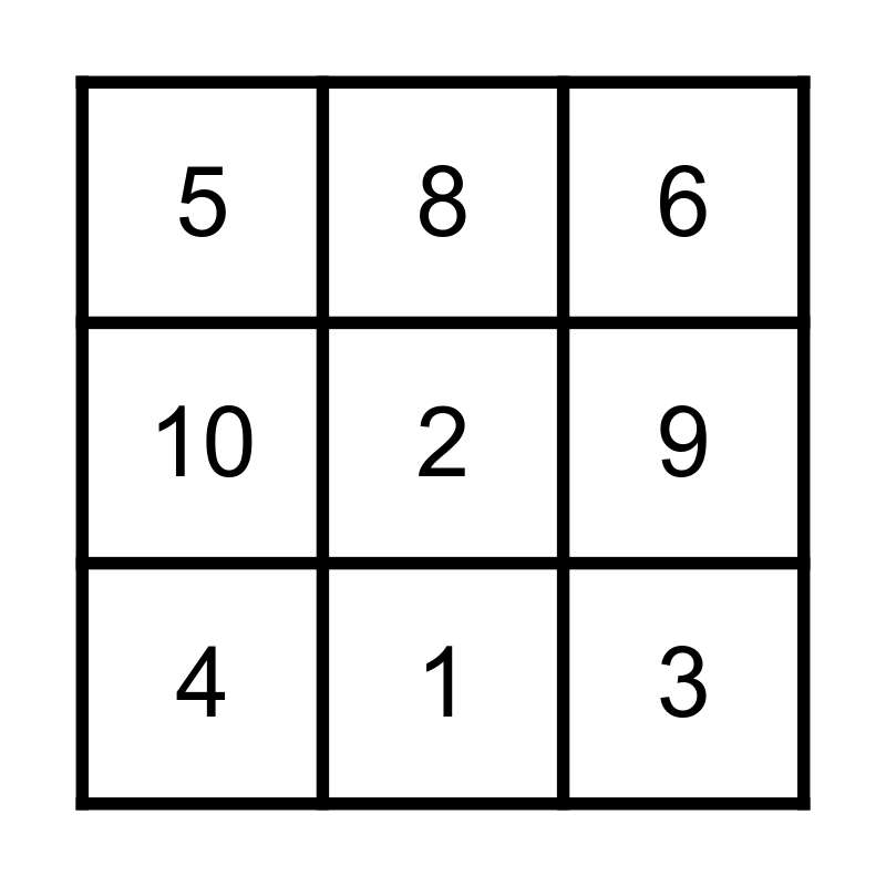 This bingo card has a free space and 10 words: 1, 6, 5, 3, 10, 4, 8, 7, 9 and 2.