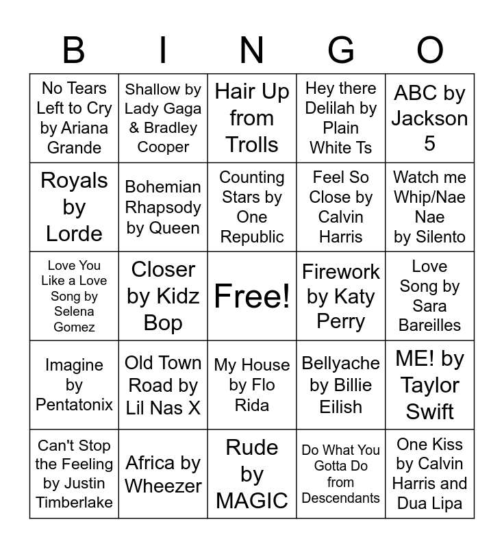 This bingo card has a free space and 39 words: 22 by Taylor Swift, I Don't Care by Ed Sheeran, Alone by Marshmello, Bohemian Rhapsody by Queen, Can't Stop the Feeling by Justin Timberlake, My House by Flo Rida, Counting Stars by One Republic, Animals by Maroon 5, ABC by Jackson 5, Imagine by Pentatonix, Closer by Kidz Bop, Hey there Delilah by Plain White Ts, One Kiss by Calvin Harris and Dua Lipa, Love Song by Sara Bareilles, Firework by Katy Perry, Old Town Road by Lil Nas X, Queen of Mean by Descendants, No Tears Left to Cry by Ariana Grande, Fight Song by Rachel Platten, Bellyache by Billie Eilish, Royals by Lorde, Rude by MAGIC, Feel So Close by Calvin Harris, Watch me Whip/Nae Nae by Silento, Bad Liar by Selena Gomez, Under the Sea from the little mermaid, Remember Me from Coco, Panini by Lil Nas X, Keep Your Head Up by Andy Grammar, Shallow by Lady Gaga & Bradley Cooper, Scars To Your Beautiful by Allesia Cara, ...Ready For It? by Taylor Swift, Hair Up from Trolls, Africa by Wheezer, Do What You Gotta Do from Descendants, Surfin' USA by the Beach Boys, ME! by Taylor Swift, Love You Like a Love Song by Selena Gomez and Walking On Sunshine by Katrina & the Waves.