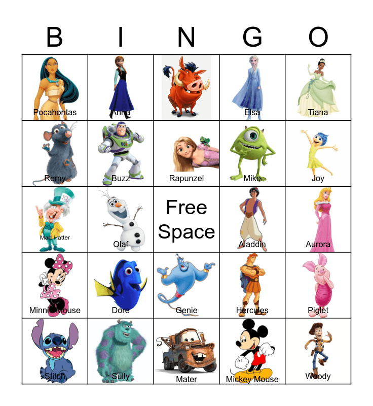 This bingo card has 32 images, a free space and 31 words: Mickey Mouse, Winnie the Pooh, Olaf, Lightniing McQueen, Minnie Mouse, Buzz, Tiana, Piglet, Anna, Simba, Rapunzel, Flounder, Snow White, Aladdin, Pinocchio, Stitch, Mad Hatter, Genie, Dore, Hercules, Cheshire Cat, Aurora, Sully, Woody, Elsa, Mike, Remy, Pocahontas, Mater, Maui and Joy.