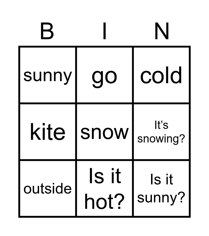 This bingo card has 15 words: hot, rain, cold, sunny, Is it hot?, snow, windy, It’s raining., It’s snowing?, Is it sunny?, umbrella, kite, outside, go and can.