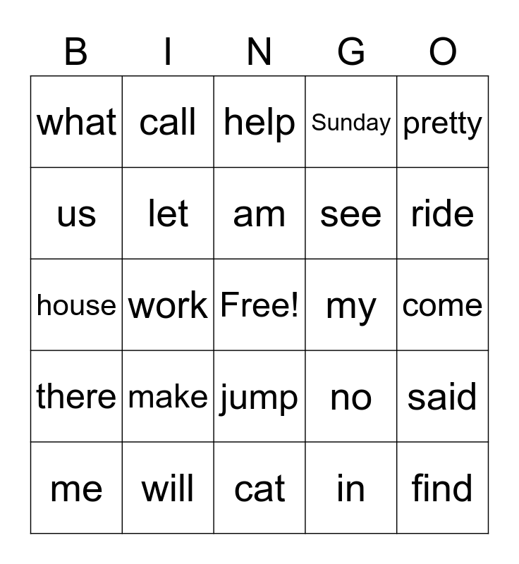 This bingo card has a free space and 24 words: make, will, am, me, pretty, what, us, call, my, jump, see, house, no, said, let, in, come, help, ride, work, find, there, Sunday and cat.