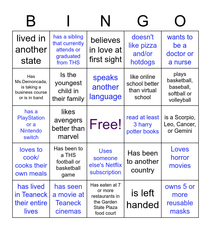 This bingo card has a free space and 24 words: has lived in Teaneck their entire lives, Has been to a THS football or basketball game, speaks another language, is left handed, wants to be a doctor or a nurse, lived in another state, has a sibling that currently attends or graduated from THS, believes in love at first sight, read at least 3 harry potter books, is a Scorpio, Leo, Cancer, or Gemini, has a PlayStation or a Nintendo switch, Is the youngest child in their family, Has been to another country, Loves horror movies, Has Ms.Demoncada, is taking a business course or is in band, has seen a movie at Teaneck cinemas, Has eaten at 7 or more restaurants in the Garden State Plaza food court, doesn't like pizza and/or hotdogs, plays basketball, baseball, softball or volleyball, loves to cook/ cooks their own meals, likes avengers better than marvel, Uses someone else's Netflix subscription, like online school better than virtual school and owns 5 or more reusable masks.
