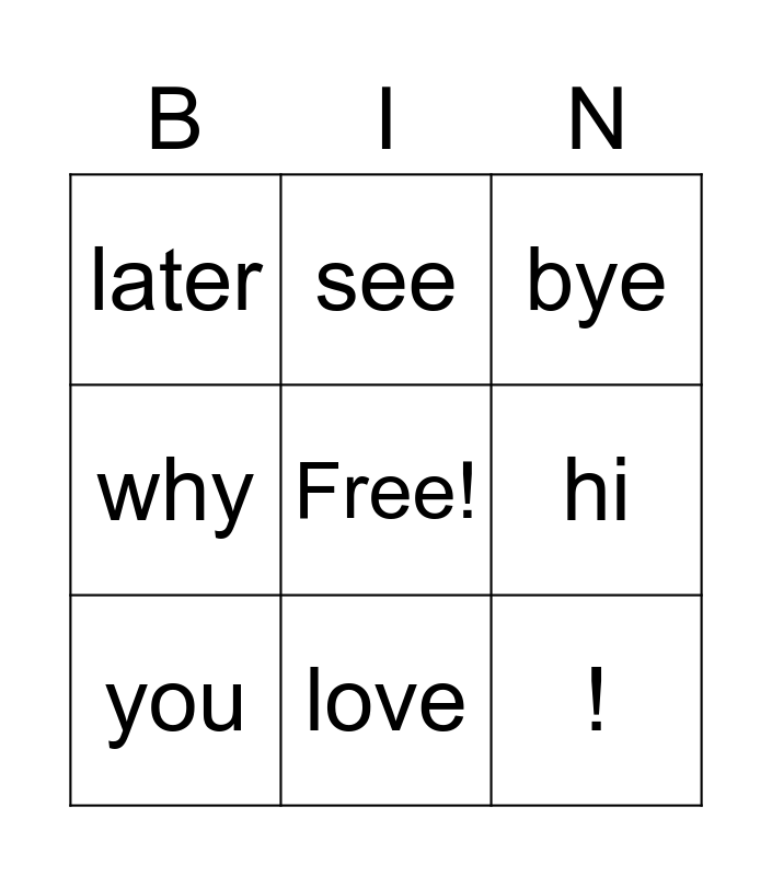 This bingo card has a free space and 8 words: hi, bye, see, you, later, !, why and love.