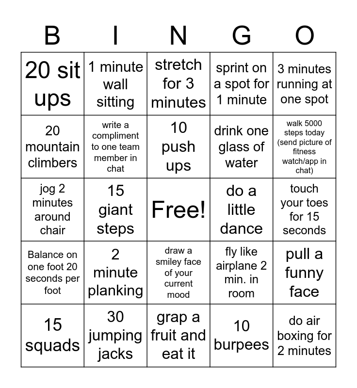 This bingo card has a free space and 24 words: 2 minute planking, 30 jumping jacks, 10 push ups, 15 squads, 3 minutes running at one spot, 20 sit ups, 20 mountain climbers, 1 minute wall sitting, do a little dance, draw a smiley face of your current mood, drink one glass of water, jog 2 minutes around chair, fly like airplane 2 min. in room, pull a funny face, write a compliment to one team member in chat, 10 burpees, touch your toes for 15 seconds, stretch for 3 minutes, walk 5000 steps today (send picture of fitness watch/app in chat), 15 giant steps, do air boxing for 2 minutes, Balance on one foot 20 seconds per foot, sprint on a spot for 1 minute and grap a fruit and eat it.