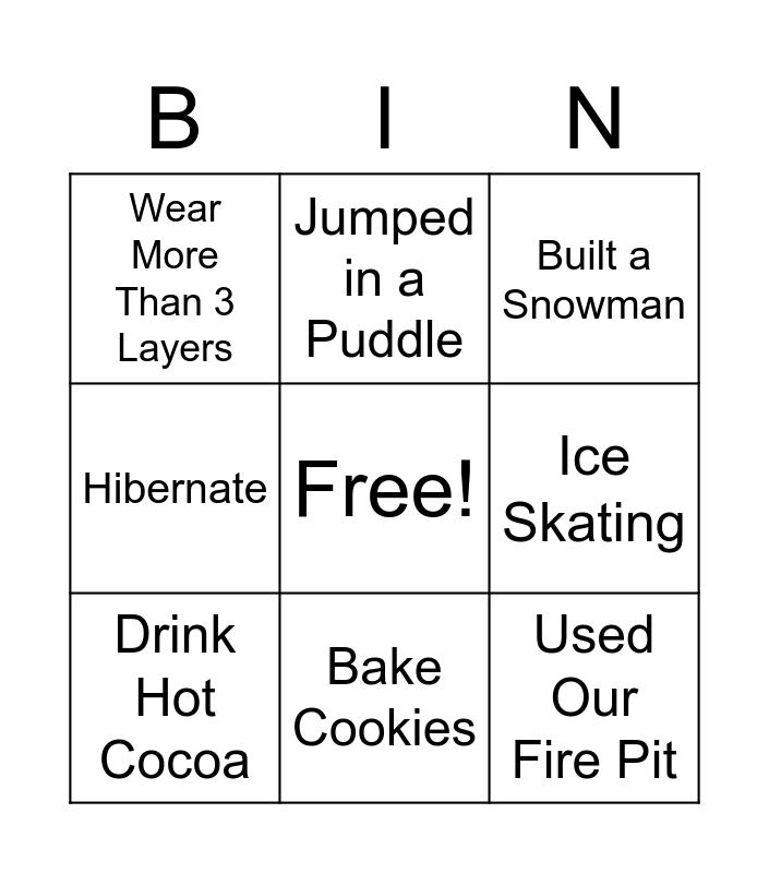 This bingo card has a free space and 8 words: Ice Skating, Built a Snowman, Jumped in a Puddle, Drink Hot Cocoa, Wear More Than 3 Layers, Used Our Fire Pit, Hibernate and Bake Cookies.