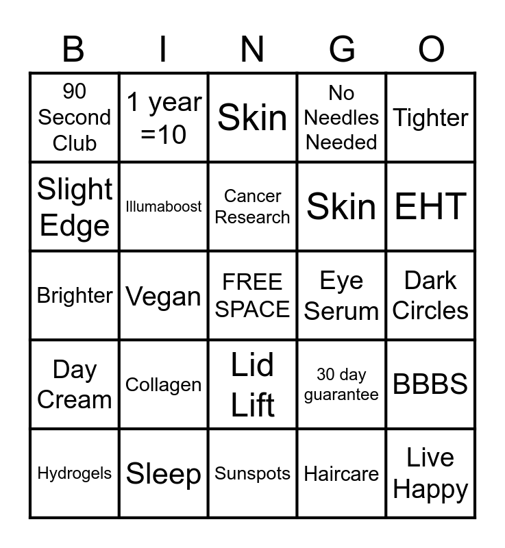 This bingo card has a free space and 29 words: Facewash, Sleep, Skin, Holistic, Tighter, 90 Second Club, Illumaboost, Cancer Research, Eye Serum, BBBS, Hydrogels, Vegan, Haircare, Live Happy, Brighter, Night cream, Sunspots, 30 day guarantee, EHT, Day Cream, Collagen, Healthy, Skin, Dark Circles, Slight Edge, 1 year =10, Lid Lift, No Needles Needed and 7 years.