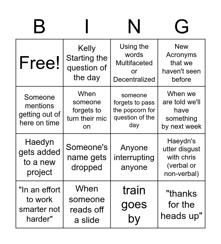 This bingo card has 16 words: "In an effort to work smarter not harder", When someone reads off a slide, Using the words Multifaceted or Decentralized, New Acronyms that we haven't seen before, Someone mentions getting out of here on time, Kelly Starting the question of the day, Anyone interrupting anyone, Haeydn's utter disgust with chris (verbal or non-verbal), Free!, When someone forgets to turn their mic on, train goes by, When we are told we'll have something by next week, Haedyn gets added to a new project, Someone's name gets dropped, someone forgets to pass the popcorn for question of the day and "thanks for the heads up".