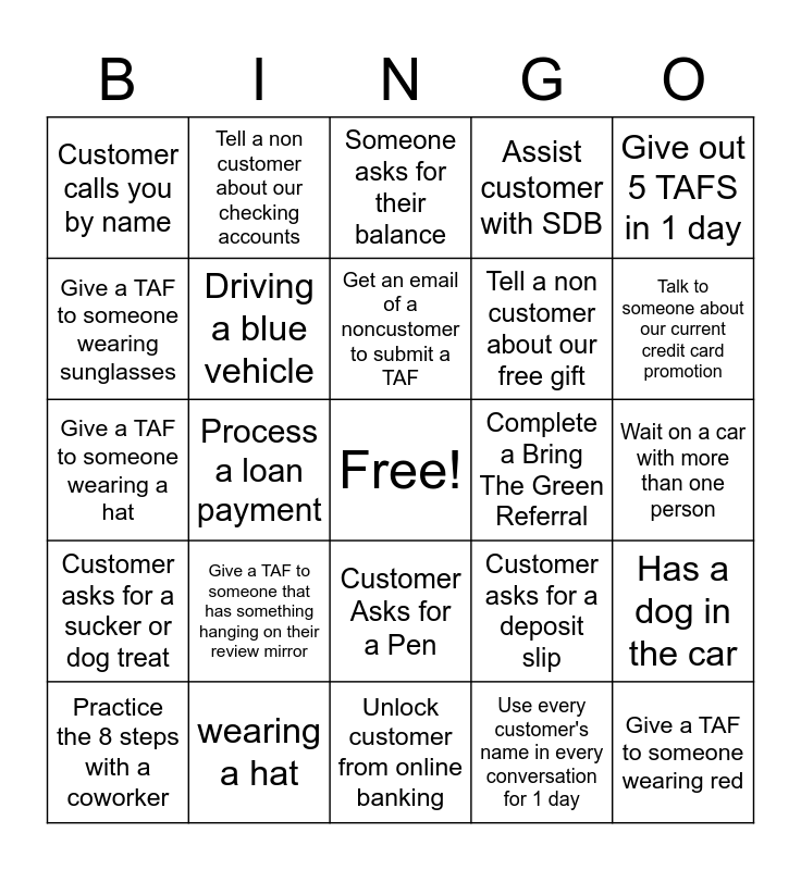 This bingo card has a free space and 24 words: Give a TAF to someone that has something hanging on their review mirror, wearing a hat, Get an email of a noncustomer to submit a TAF, Practice the 8 steps with a coworker, Give out 5 TAFS in 1 day, Customer calls you by name, Give a TAF to someone wearing sunglasses, Tell a non customer about our checking accounts, Complete a Bring The Green Referral, Customer Asks for a Pen, Tell a non customer about our free gift, Give a TAF to someone wearing a hat, Customer asks for a deposit slip, Has a dog in the car, Driving a blue vehicle, Use every customer's name in every conversation for 1 day, Wait on a car with more than one person, Someone asks for their balance, Talk to someone about our current credit card promotion, Process a loan payment, Give a TAF to someone wearing red, Customer asks for a sucker or dog treat, Assist customer with SDB and Unlock customer from online banking.