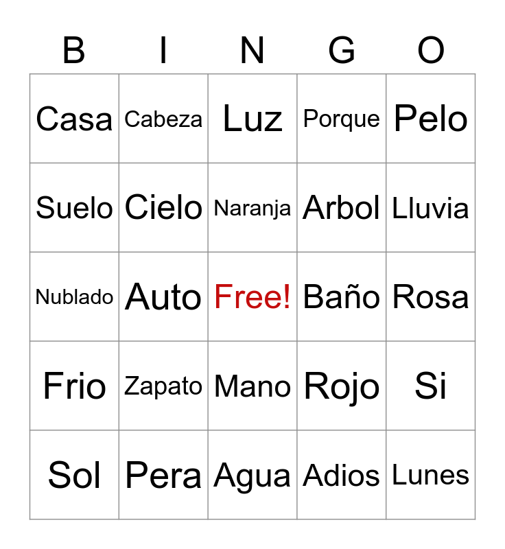This bingo card has a free space and 29 words: Sol, Azul, Auto, Pluma, Casa, Luz, Cielo, Zapato, Baño, Pera, Rosa, Lunes, Agua, Adios, Lluvia, Hola, Mano, Frio, Pelo, Nublado, Rojo, Tio, Arbol, Suelo, Porque, Cabeza, Si, Naranja and Zanahoria.