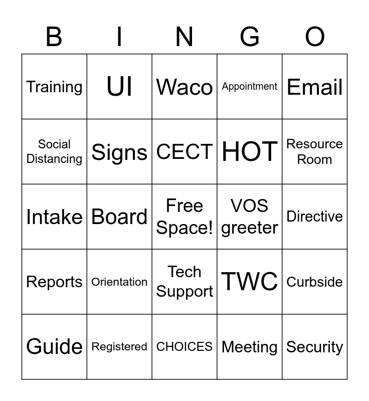This bingo card has a free space and 50 words: Virtual, Security, SNAP, CHOICES, Orientation, RESEA, UI, WIOA, Social Distancing, Hump Day, Signs, Appointment, Curbside, TWC, Workforce, Managers, CECT, VOS greeter, WIT, Email, Board, Meeting, Training, HOT, Enroll, Zoom, Resource Room, Rural, Waco, Tech Support, Helpdesk Ticket, Teams, TWIST, Outreach, Registered, Attended, Swipeclock, Masks, Assist, Directive, Powerpoint, Screen share, Mindful minute, HR, Guide, Intake, 6 ft, Programs, Reports and Jobs.