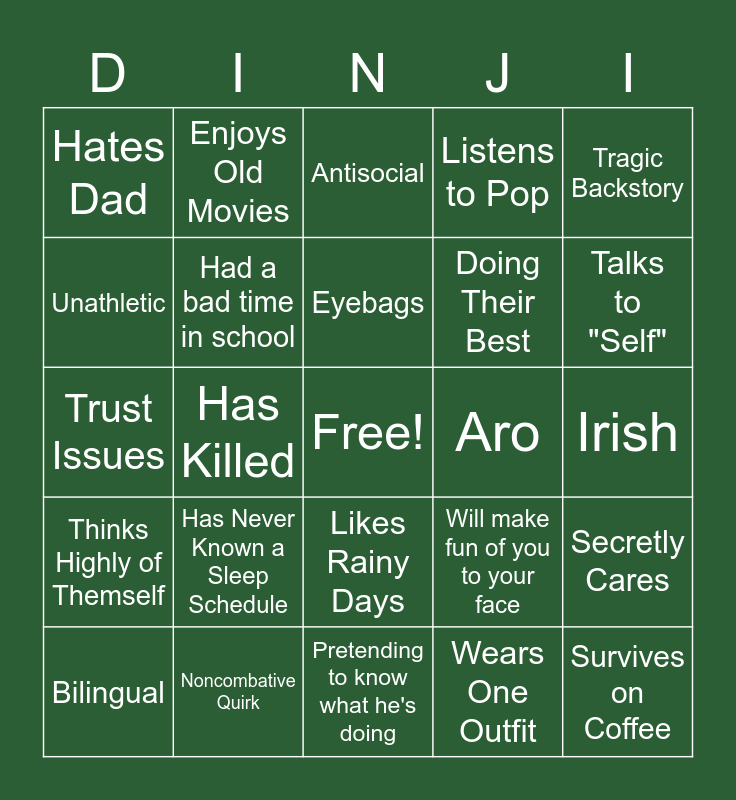 This bingo card has a free space and 24 words: Has Never Known a Sleep Schedule, Noncombative Quirk, Eyebags, Bilingual, Tragic Backstory, Hates Dad, Unathletic, Enjoys Old Movies, Aro, Likes Rainy Days, Doing Their Best, Trust Issues, Will make fun of you to your face, Secretly Cares, Had a bad time in school, Wears One Outfit, Irish, Antisocial, Talks to "Self", Has Killed, Survives on Coffee, Thinks Highly of Themself, Listens to Pop and Pretending to know what he's doing.