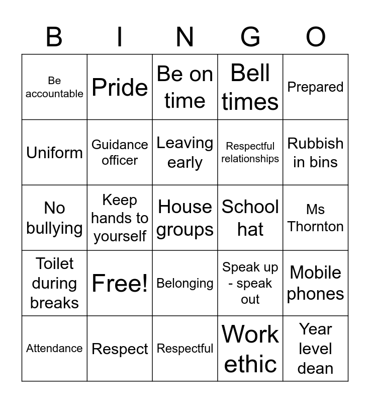 This bingo card has 25 words: Free!, Respectful, Leaving early, Attendance, Prepared, Be accountable, Uniform, Pride, School hat, Belonging, Respectful relationships, No bullying, Speak up - speak out, Mobile phones, Guidance officer, Year level dean, Ms Thornton, Be on time, Rubbish in bins, Keep hands to yourself, House groups, Respect, Toilet during breaks, Bell times and Work ethic.