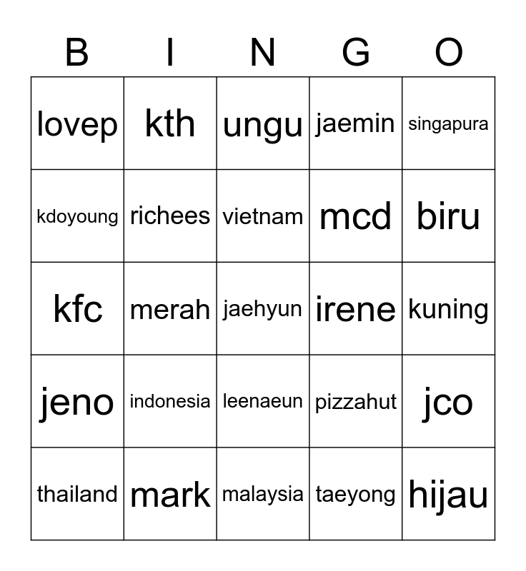 This bingo card has 25 words: indonesia, malaysia, vietnam, thailand, singapura, lovep, kdoyoung, kth, irene, leenaeun, mcd, kfc, pizzahut, jco, richees, hijau, kuning, ungu, biru, merah, jaehyun, mark, jeno, jaemin and taeyong.