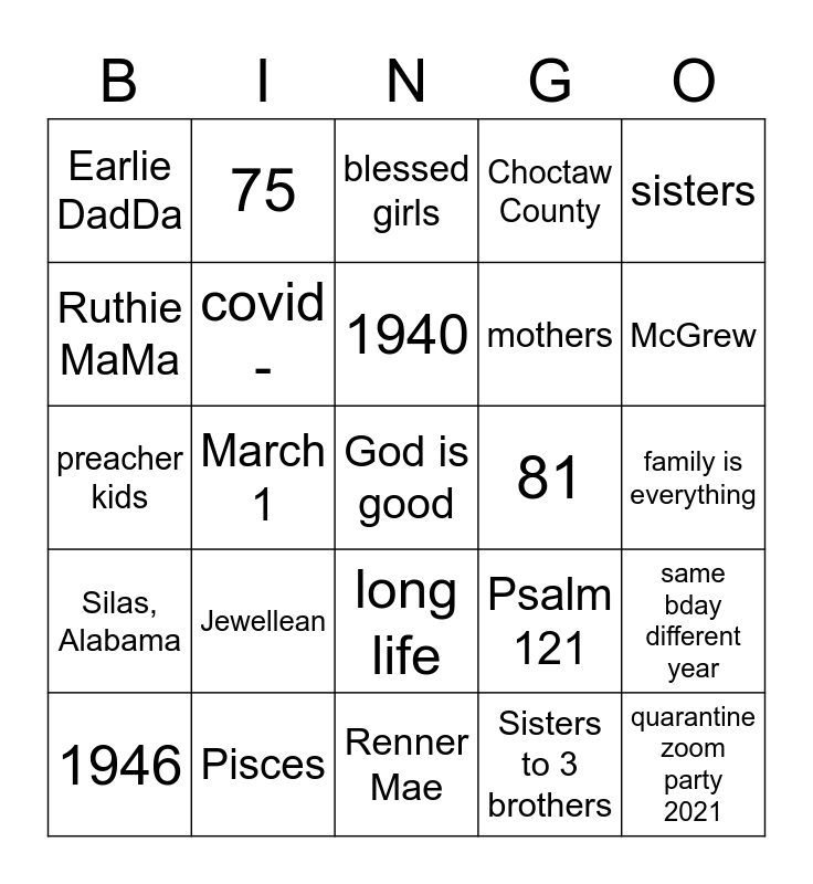 This bingo card has 25 words: Jewellean, Renner Mae, 1940, 1946, sisters, Earlie DadDa, Ruthie MaMa, 75, 81, long life, mothers, preacher kids, Psalm 121, same bday different year, covid -, quarantine zoom party 2021, family is everything, blessed girls, McGrew, March 1, God is good, Pisces, Silas, Alabama, Choctaw County and Sisters to 3 brothers.