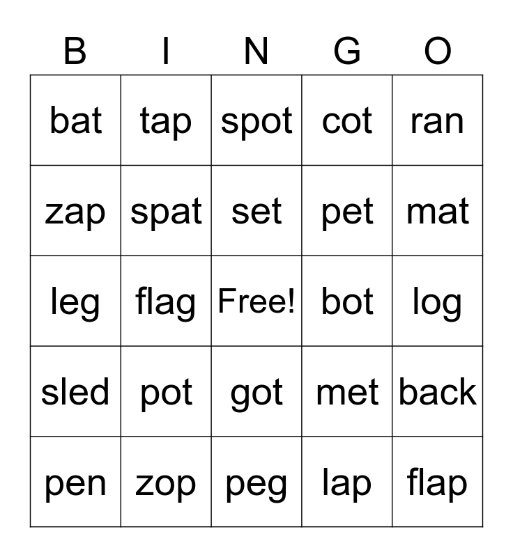 This bingo card has a free space and 24 words: pot, zop, set, pen, ran, bat, zap, tap, bot, got, pet, leg, met, back, spat, lap, log, spot, mat, flag, flap, sled, cot and peg.