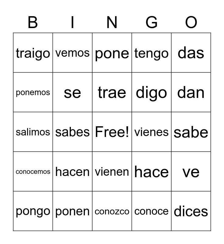 This bingo card has a free space and 55 words: hago, pongo, salgo, traigo, conozco, doy, se, veo, digo, vengo, tengo, haces, pones, sales, traes, conoces, das, sabes, ves, dices, vienes, tienes, hace, pone, sale, trae, conoce, da, sabe, ve, dice, viene, tiene, hacemos, ponemos, salimos, traemos, conocemos, damos, sabemos, vemos, decimos, venimos, tenemos, hacen, ponen, salen, traen, conocen, dan, saben, ven, dicen, vienen and tienen.