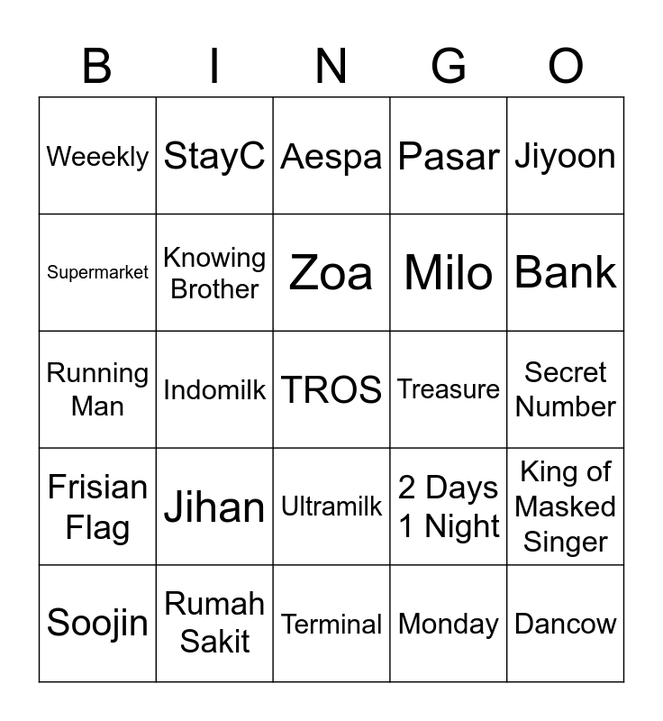 This bingo card has a free space and 24 words: Soojin, Jihan, Zoa, Monday, Jiyoon, Weeekly, StayC, Aespa, Treasure, Secret Number, Running Man, Knowing Brother, 2 Days 1 Night, King of Masked Singer, Supermarket, Rumah Sakit, Terminal, Pasar, Bank, Frisian Flag, Indomilk, Ultramilk, Milo and Dancow.