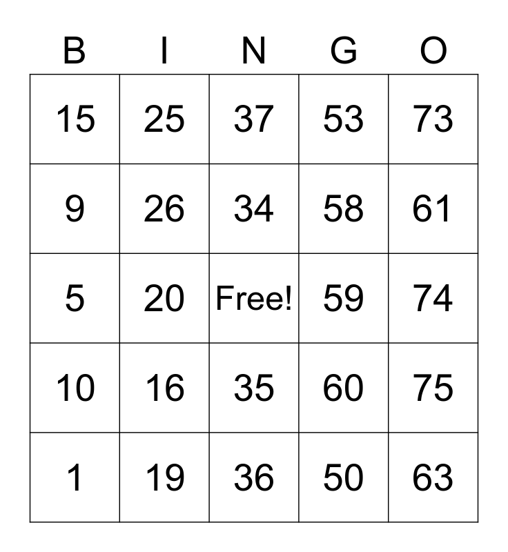 This bingo card has a free space and 24 words: 1, 16, 34, 50, 73, 15, 25, 37, 59, 74, 5, 26, 60, 75, 9, 19, 36, 53, 61, 10, 20, 35, 58 and 63.