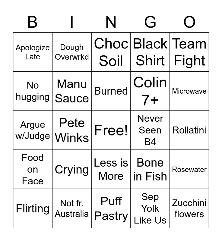 This bingo card has a free space and 38 words: No Crispy, Cat Fight, "Sensational", Manu Sauce, Rosewater, Crying, Burned, Bleeding, Team Fight, Colin 7+, Pete Winks, Black Shirt, Zucchini flowers, Rollatini, No hugging, Food on Face, Homey, Choc Soil, Curdled/Split, Never Seen B4, Apologize Late, Not fr. Australia, Microwave, Flirting, Missing Grocery, Puff Pastry, Quit Show, Flames, Nurse, Tool breaks, Menu Boo Boo, Less is More, Sep Yolk Like Us, Dough Overwrkd, TY to Guests, Bone in Fish, Argue w/Judge and Rain.