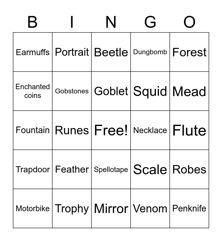 This bingo card has a free space and 79 words: Armchair, Beaded handbag, Beetle, Bezoar, Birthday cake, Biscuit, Bowler hat, Cauldron, Chamber, Crystal ball, Deluminator, Dragon Heartstring, Dungbomb, Earmuffs, Egg, Enchanted coins, Fang, Feather, Floo Powder, Flute, Foe-glass, Forest, Fountain, Goblet, Gobstones, Gravestone, Hand of Glory, Hourglass, Howler, Lilac, Mead, Memories, Mirror, Moon, Motorbike, Necklace, Omnioculars, Parchment, Passageway, Penknife, Pensieve, Phoenix Feather, Pig tail, Pink Umbrella, Portkey, Portrait, Prison, Prophecy, Put-outer, Remembrall, Robes, Runes, Scale, Shack, Skelegro, Sneakoscope, Snitch, Snuff box, Sock, Spellotape, Squid, Star charts, Statue, Tapestry, Tattoo, Tea cup, Tea leaves, Time Turner, Tower, Trapdoor, Trophy, Trunk, Vanishing cabinet, Vault, Veil, Venom, Watch, Weasley Clock and Wizards Chess.