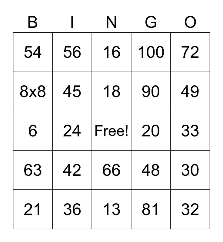 This bingo card has a free space and 24 words: 42, 36, 18, 21, 72, 54, 8x8, 56, 20, 66, 90, 6, 48, 30, 45, 81, 33, 16, 49, 24, 32, 63, 100 and 13.