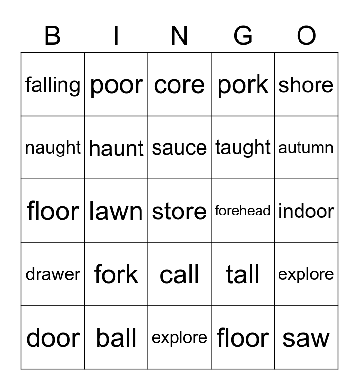 This bingo card has a free space and 24 words: fork, ball, sauce, door, shore, falling, naught, poor, forehead, call, taught, floor, tall, explore, haunt, floor, indoor, core, autumn, lawn, saw, drawer, pork and explore.