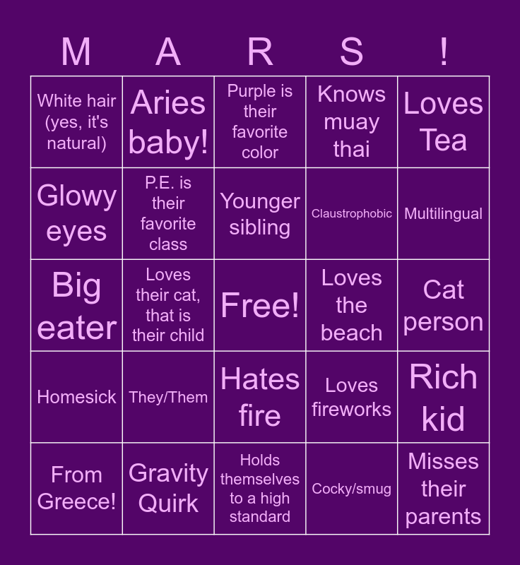 This bingo card has a free space and 24 words: They/Them, Gravity Quirk, Younger sibling, From Greece!, Loves Tea, White hair (yes, it's natural), Glowy eyes, Aries baby!, Loves the beach, Hates fire, Claustrophobic, Big eater, Loves fireworks, Rich kid, P.E. is their favorite class, Cocky/smug, Cat person, Purple is their favorite color, Multilingual, Loves their cat, that is their child, Misses their parents, Homesick, Knows muay thai and Holds themselves to a high standard.