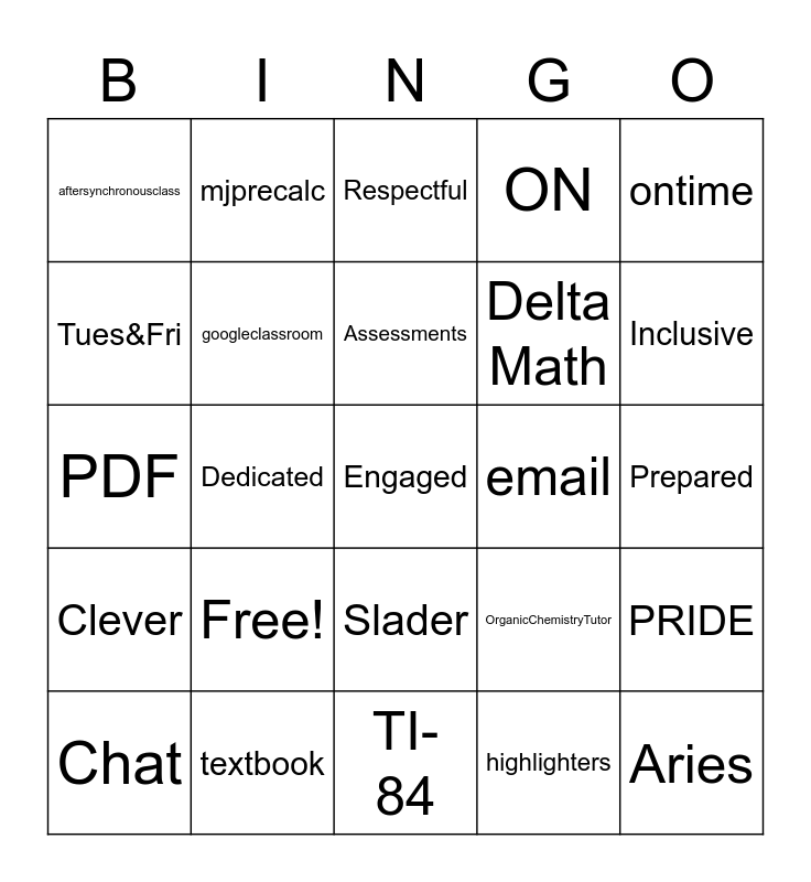 This bingo card has 25 words: Free!, TI-84, Assessments, Chat, ontime, aftersynchronousclass, Tues&Fri, mjprecalc, email, Slader, Delta Math, PDF, OrganicChemistryTutor, PRIDE, googleclassroom, Aries, Prepared, Respectful, Inclusive, Dedicated, Engaged, textbook, Clever, ON and highlighters.
