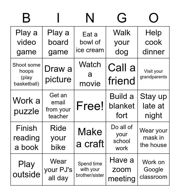 This bingo card has a free space and 24 words: Ride your bike, Wear your PJ's all day, Watch a movie, Play outside, Help cook dinner, Play a video game, Shoot some hoops (play basketball), Play a board game, Build a blanket fort, Make a craft, Call a friend, Work a puzzle, Do all of your school work, Wear your mask in the house, Draw a picture, Have a zoom meeting, Stay up late at night, Eat a bowl of ice cream, Visit your grandparents, Get an email from your teacher, Work on Google classroom, Finish reading a book, Walk your dog and Spend time with your brother/sister.