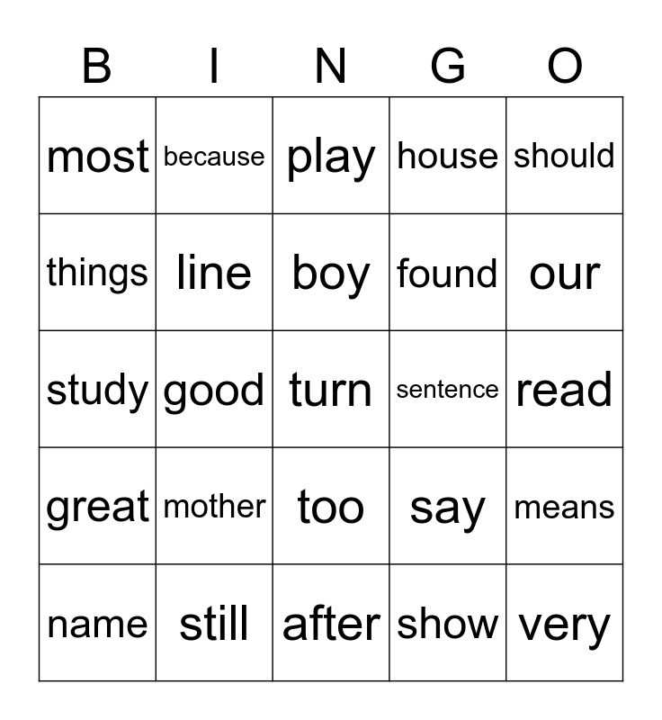 This bingo card has a free space and 24 words: mother, still, boy, name, should, most, things, because, sentence, too, found, study, say, means, line, show, read, play, our, good, very, great, house and after.