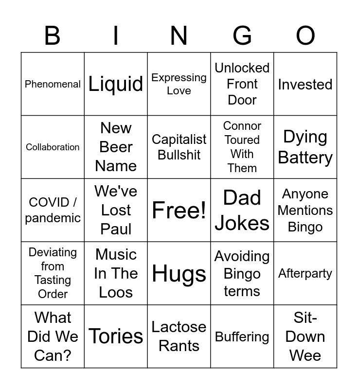 This bingo card has a free space and 44 words: Dope, Sit-Down Wee, You're On Mute, What Did We Can?, Bangin, Buffering, Expressing Love, Hop Selection, Invested, Tories, Unlocked Front Door, Dad Jokes, Hugs, Music In The Loos, Slurring, Lactose Rants, Paul Gets Burned, COVID / pandemic, Beer Festival, Dying Battery, Liquid, Beautiful Human Being, What's That Noise?, Phenomenal, Pal, Anyone Mentions Bingo, They're Late!, Echo, Avoiding Bingo terms, Deviating from Tasting Order, Technical Difficulties, Afterparty, Supermarket Beer, Phrasing, We've Lost Paul, Stay Hydrated, Paul Doesn't Take It Easy, Deep Answers, Capitalist Bullshit, Collaboration, Connor Toured With Them, Helen's Mother, New Beer Name and Paul Doesn't Know.