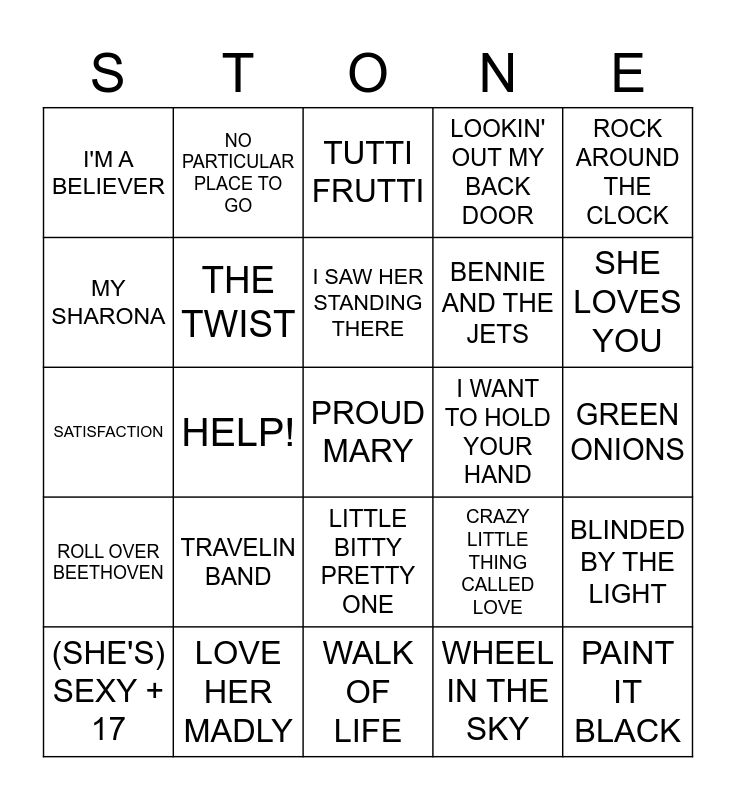 This bingo card has a free space and 33 words: JOHNNY B. GOODE, LONG COOL WOMEN, HELP!, JAILHOUSE ROCK, ROLL OVER BEETHOVEN, THE TWIST, ROCK AROUND THE CLOCK, (SHE'S) SEXY + 17, NO PARTICULAR PLACE TO GO, HIT THE ROAD JACK, I SAW HER STANDING THERE, TUTTI FRUTTI, BAD MOON RISING, A HARD DAY'S NIGHT, I WANT TO HOLD YOUR HAND, SHE LOVES YOU, LOVE HER MADLY, SATISFACTION, TRAVELIN BAND, CRAZY LITTLE THING CALLED LOVE, LITTLE BITTY PRETTY ONE, BORN TO BE WILD, I'M A BELIEVER, GREEN ONIONS, WALK OF LIFE, PAINT IT BLACK, LOOKIN' OUT MY BACK DOOR, BENNIE AND THE JETS, MY SHARONA, BLINDED BY THE LIGHT, BARRACUDA, WHEEL IN THE SKY and BLACK MAGIC WOMAN.