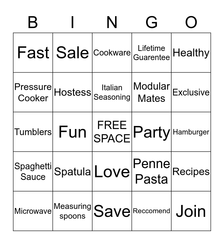 This bingo card has a free space and 24 words: Spatula, Measuring spoons, Italian Seasoning, Microwave, Healthy, Fast, Pressure Cooker, Sale, Party, Love, Modular Mates, Tumblers, Penne Pasta, Recipes, Hostess, Reccomend, Hamburger, Cookware, Exclusive, Fun, Join, Spaghetti Sauce, Lifetime Guarentee and Save.