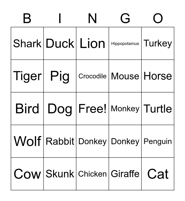 This bingo card has a free space and 29 words: Cow, Bear, Dog, Camel, Shark, Lion, Pig, Rabbit, Monkey, Skunk, Turtle, Cat, Chicken, Giraffe, Horse, Llama, Donkey, Wolf, Turkey, Bird, Donkey, Snake, Mouse, Tiger, Hippopotamus, Duck, Penguin, Crocodile and Zebra.