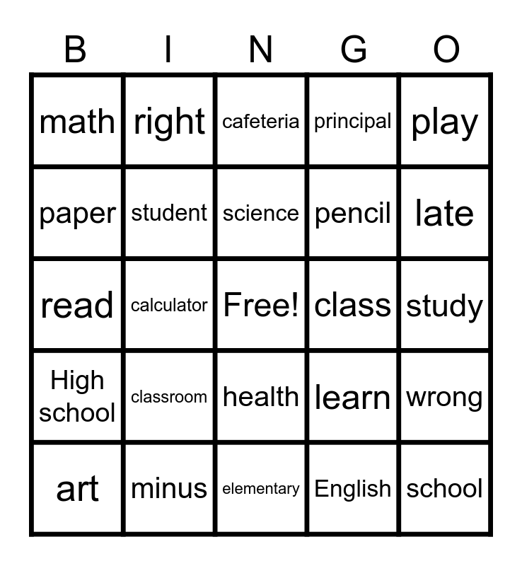 This bingo card has a free space and 29 words: art, add, calculator, book, math, cafeteria, student, classroom, class, minus, study, school, elementary, English, late, grow up, health, High school, play, read, learn, library, pencil, paper, principal, right, wrong, science and teacher.