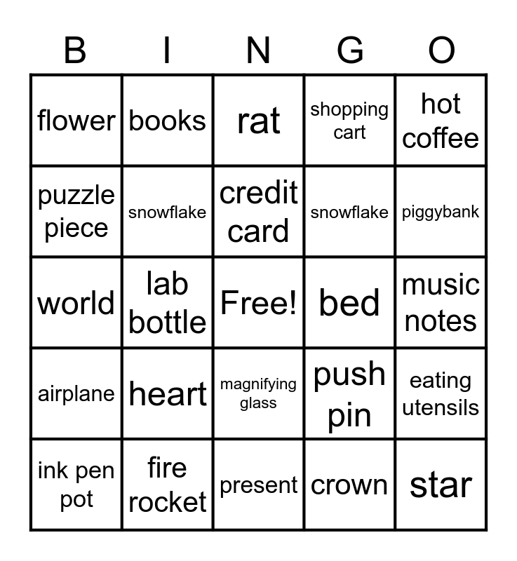 This bingo card has a free space and 24 words: heart, fire rocket, credit card, ink pen pot, hot coffee, flower, puzzle piece, books, bed, magnifying glass, snowflake, world, push pin, eating utensils, snowflake, crown, music notes, rat, piggybank, lab bottle, star, airplane, shopping cart and present.