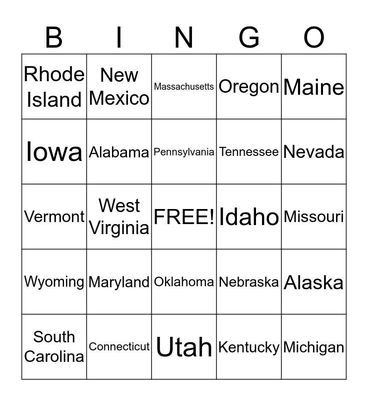 This bingo card has a free space and 24 words: Maryland, Connecticut, Pennsylvania, South Carolina, Maine, Rhode Island, Iowa, New Mexico, Idaho, Oklahoma, Tennessee, Vermont, Nebraska, Alaska, Alabama, Kentucky, Missouri, Massachusetts, Nevada, West Virginia, Michigan, Wyoming, Oregon and Utah.